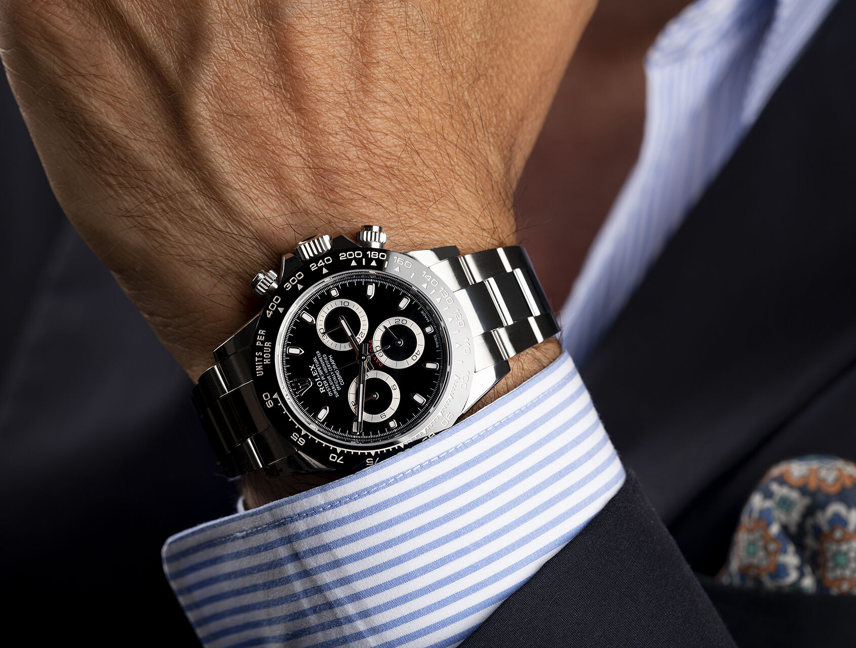 A key part of the model’s identity is the bezel moulded with a tachymetric scale for measuring average speeds of up to 400 miles or kilometres per hour. Blending high technology with sleek aesthetics, the black bezel is reminiscent of the 1965 model that was fitted with a black Plexiglas bezel insert.